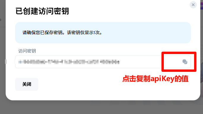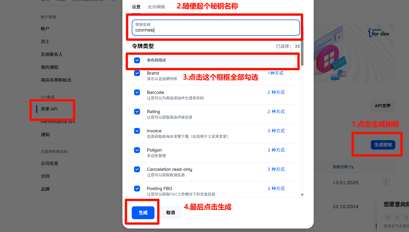 点击生成秘钥,如图所示,全部勾选,再点击生成,出现弹窗复制apiKey即可,填写到新建店铺页面的apiKey输入框中